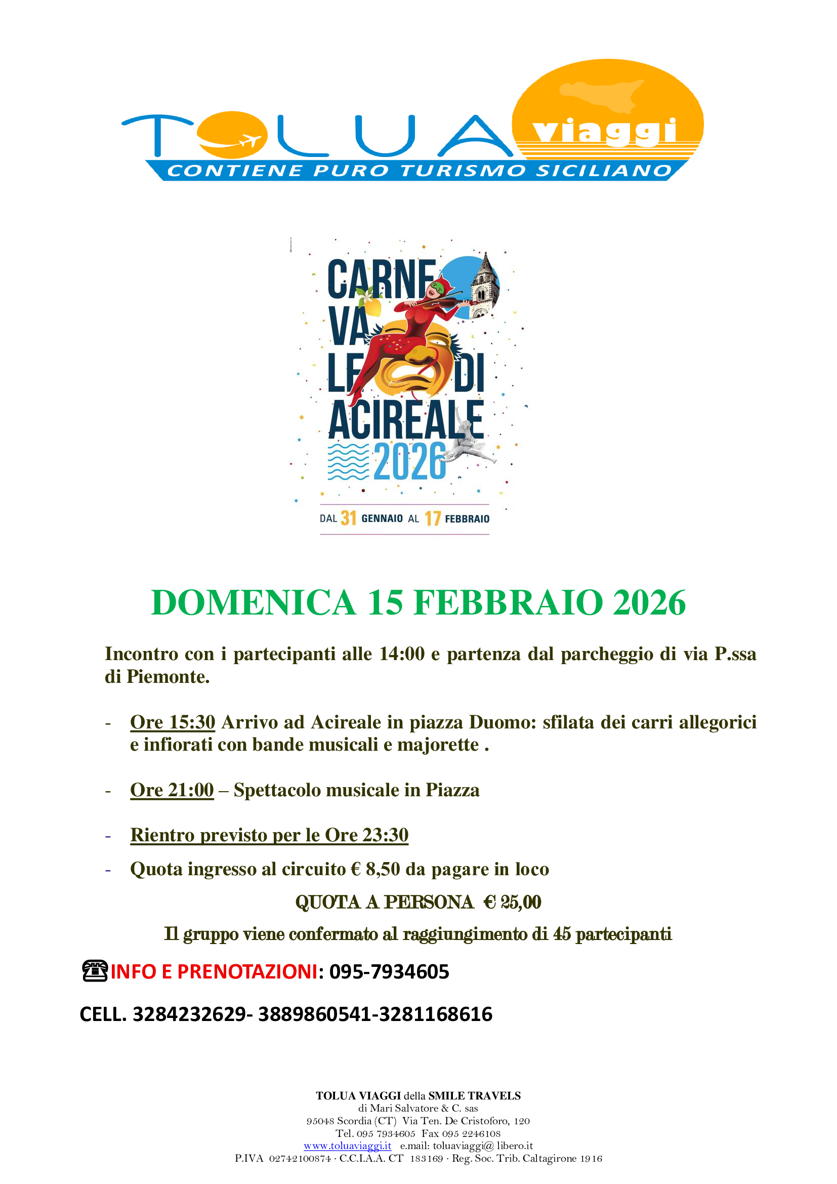 Partecipa a una gita in bus organizzata per il celebre Carnevale di Acireale, uno degli eventi pił affascinanti e ricchi di tradizione della Sicilia. Un'esperienza unica tra carri allegorici in cartapesta, maschere, sfilate e un'atmosfera festosa che coinvolge grandi e piccoli.
